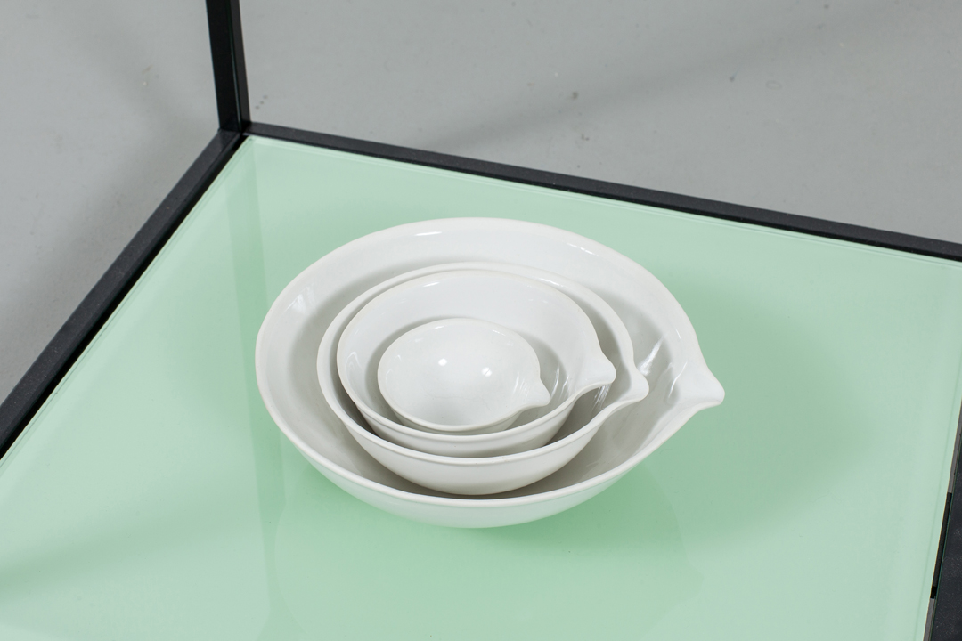 porcelain, evaporation bowls, cut shoelace, jewelers pincers, black glass, stoneware, glass, green glass, ash baseball blank, stainless steel, cherry wood, and painted steel