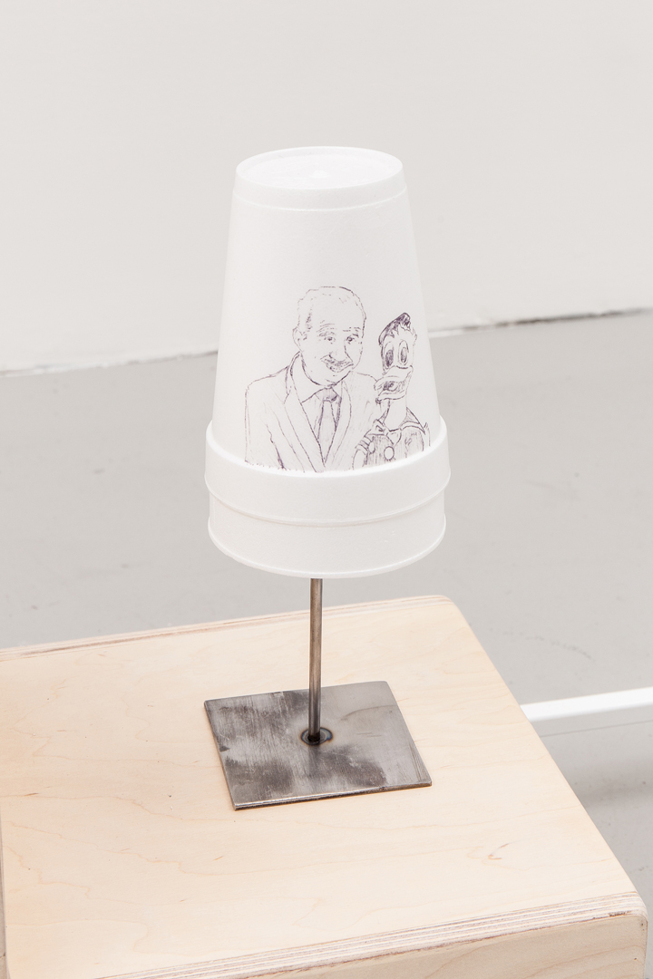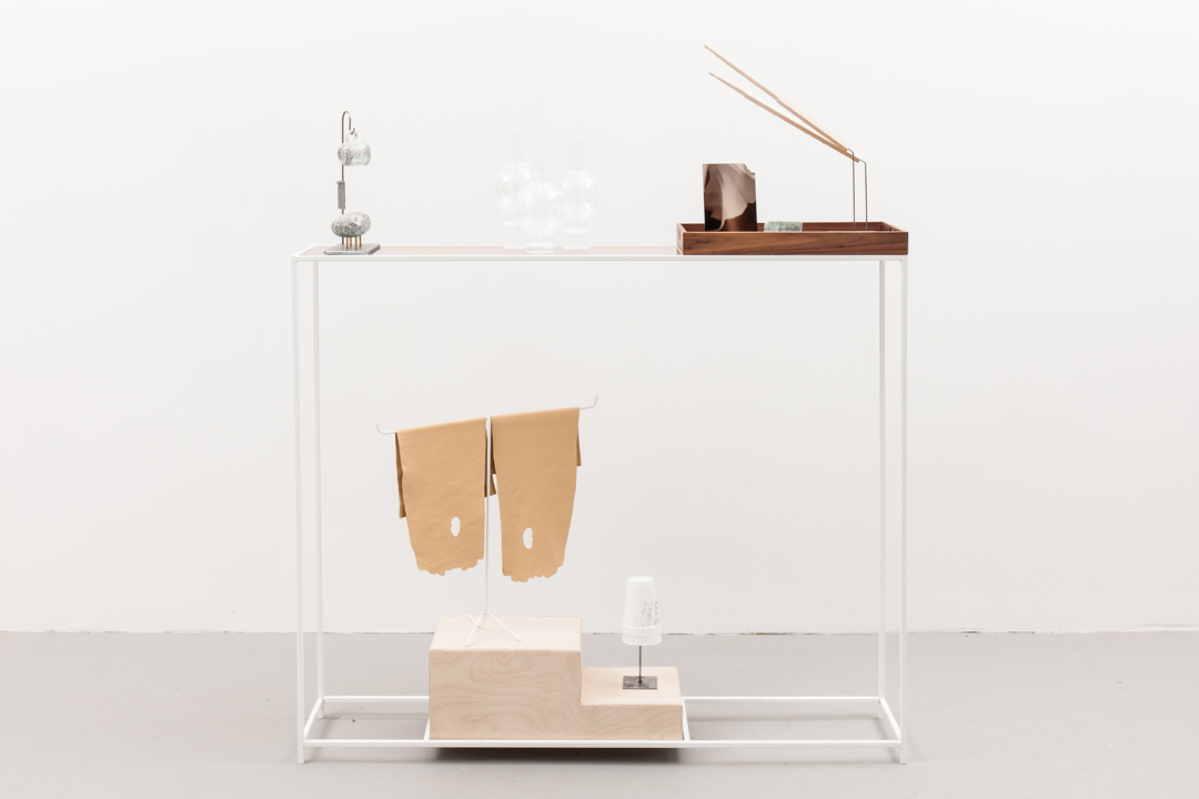 stone, ceramic cup, laminate, plexiglass image holder, laser print, aluminized print, walnut, etched glass, pink leather, styrofoam cup with ink drawing, lucite, 2-way mirror, birch plywood, walnut, steel, brass, and powdercoated steel