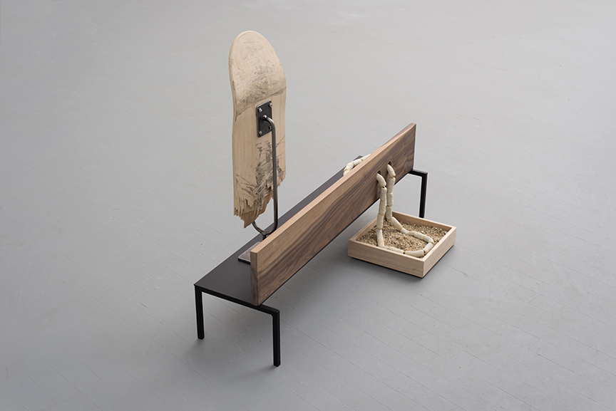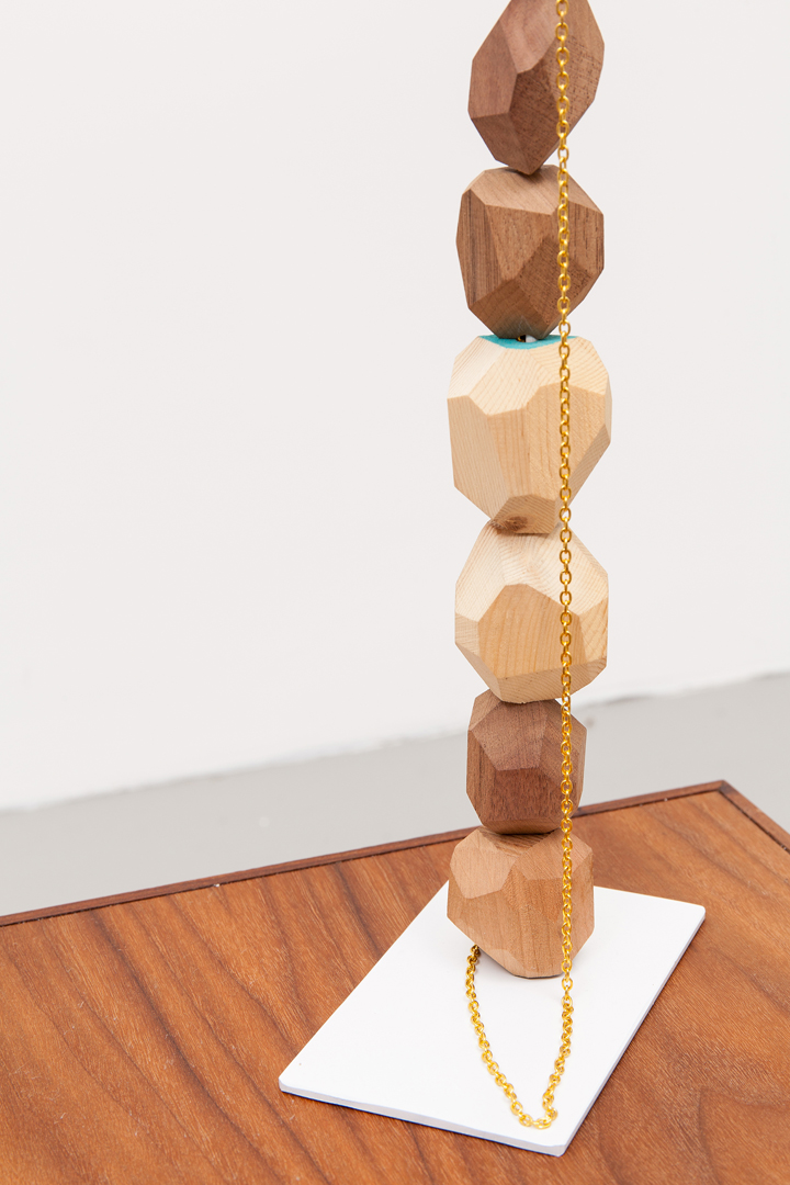 powder coated steel, walnut, glass, plaster, cord, steel, chain, cherry, pine, 2 postcards, lucite, brass, black glass eye-wash cup, 2 styrofoam pearls