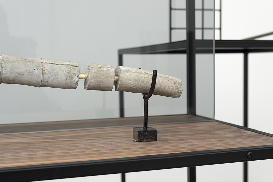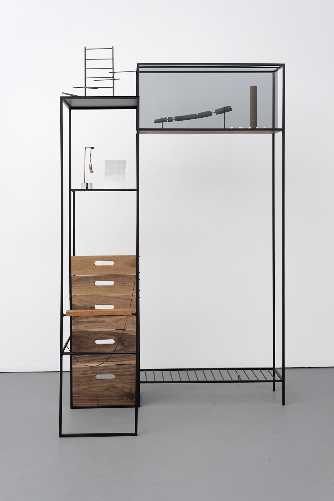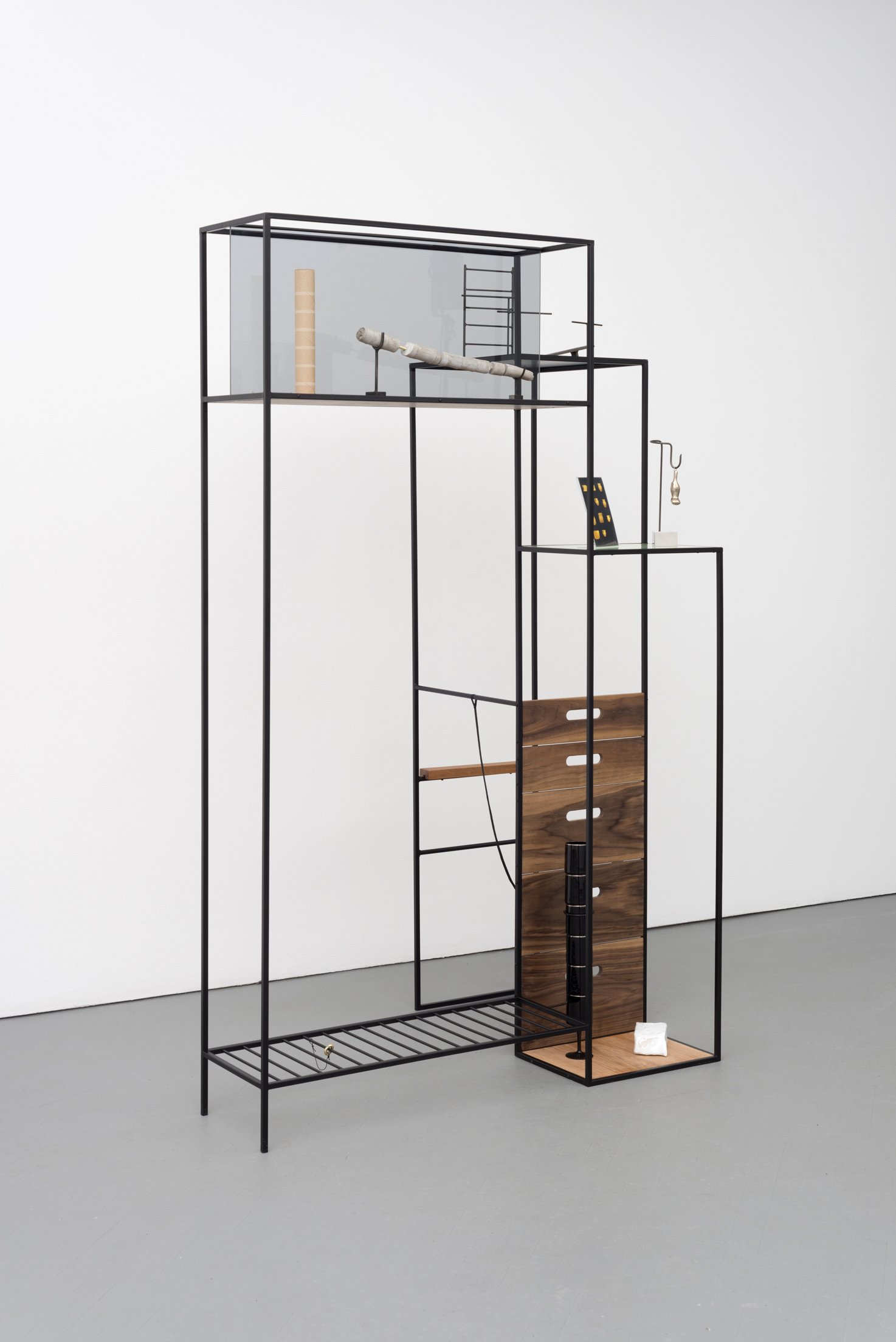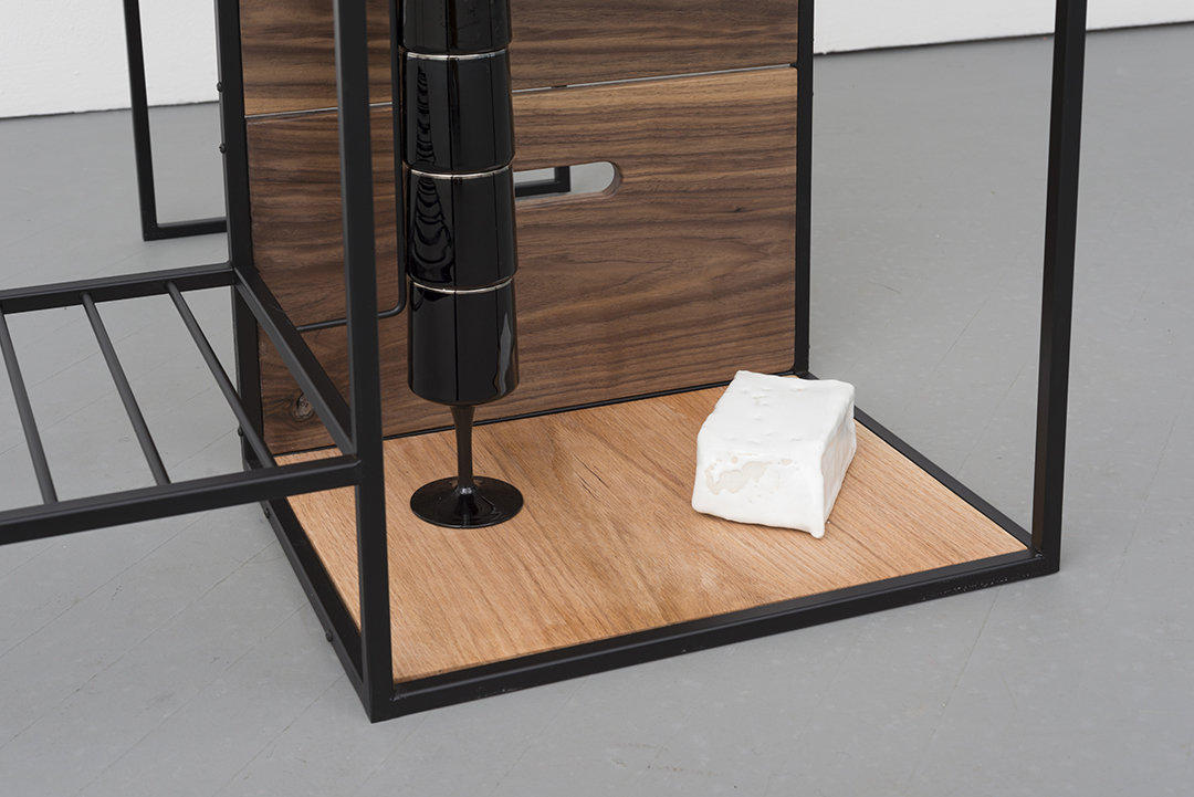 cast bronze toy popeye arm, marine-worm shells, cast duracal, brass, paper towel roll, lucite image holder, photograph, porcelain, black glassware, twine and cotton ribbon, oak, walnut, mahogany, smokey glass, blackened steel, and powdercoated steel