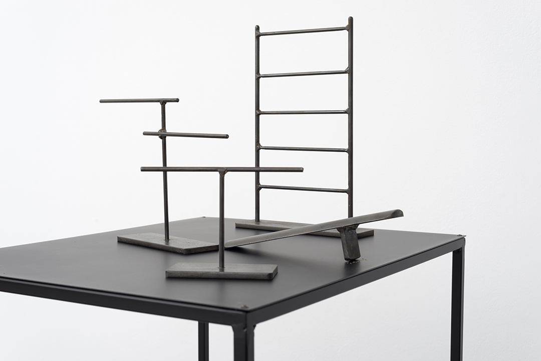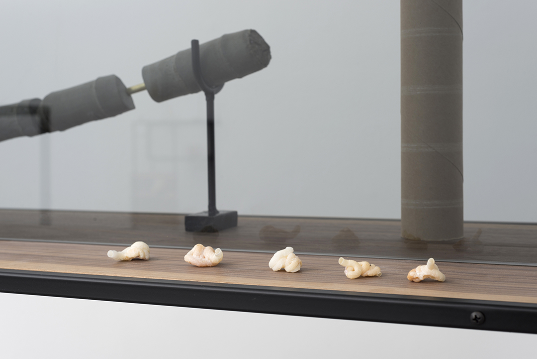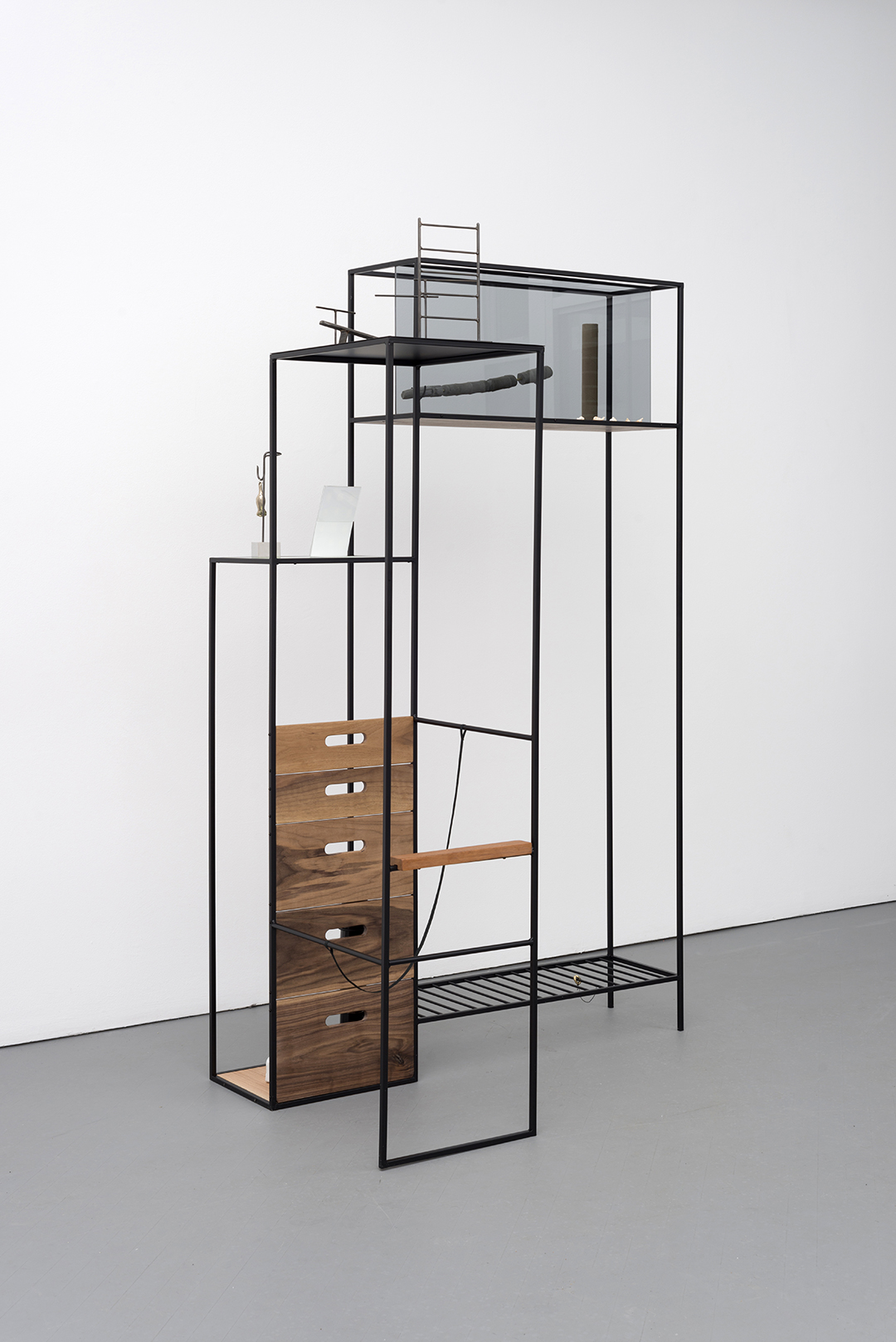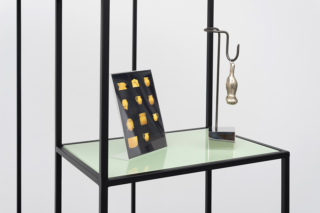 cast bronze toy popeye arm, marine-worm shells, cast duracal, brass, paper towel roll, lucite image holder, photograph, porcelain, black glassware, twine and cotton ribbon, oak, walnut, mahogany, smokey glass, blackened steel, and powdercoated steel