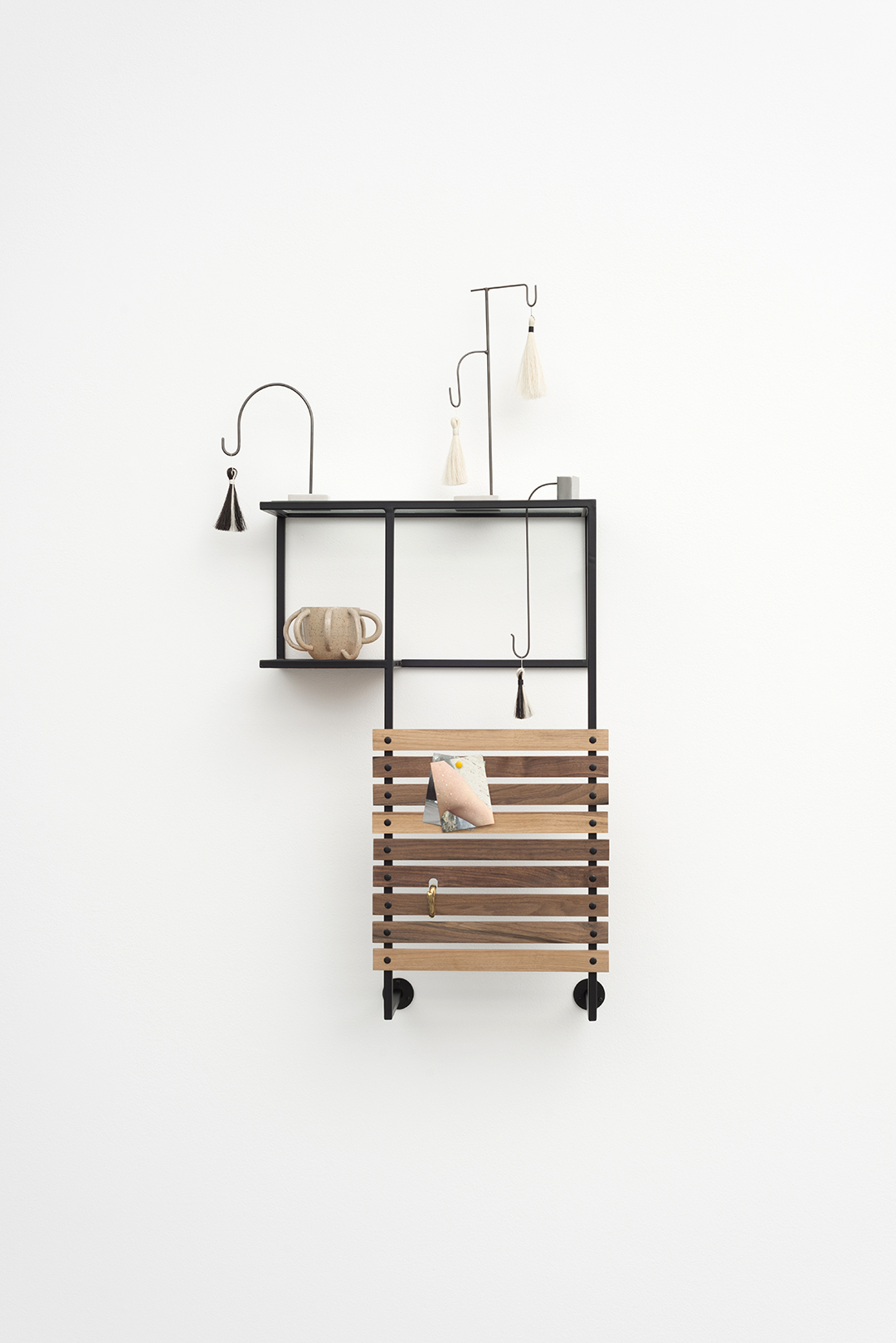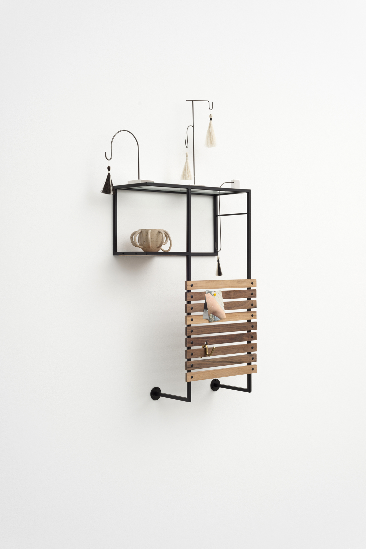 stoneware, cast brass, horse hair, photographs, thread and pushpin, walnut, oak, blackened steel, stainless steel, and powdercoated steel