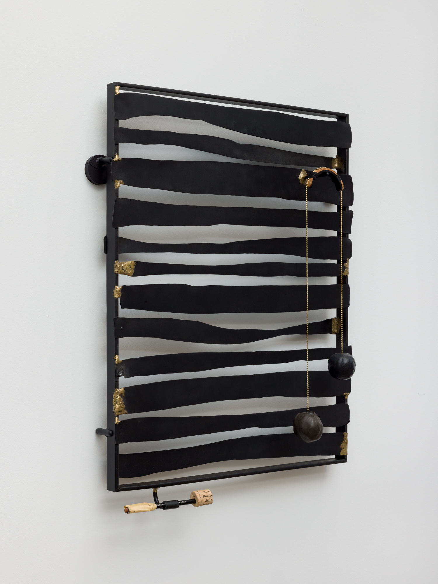 found pencil, cork, gold-plated chain stoneware balls, black oxide and braised steel