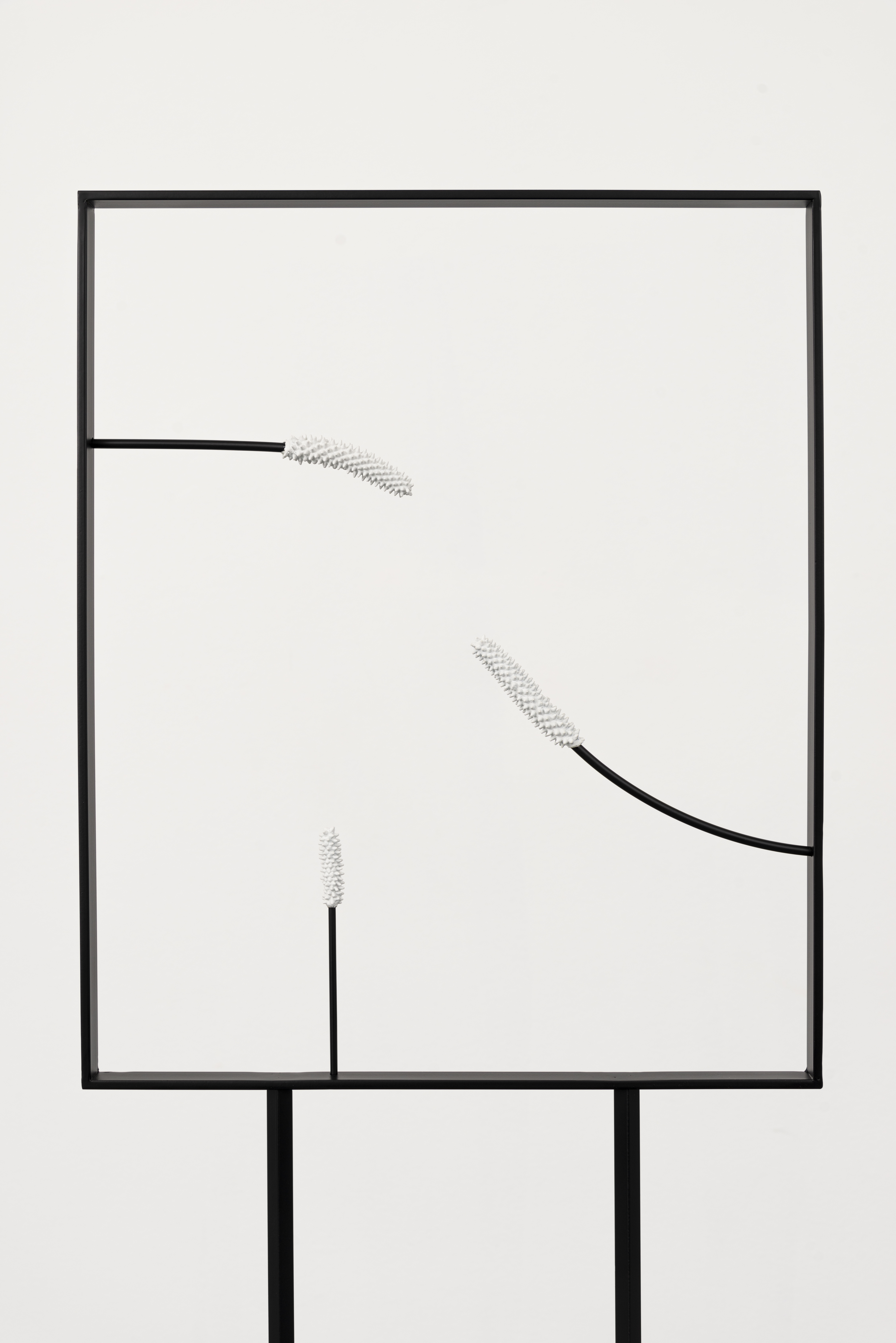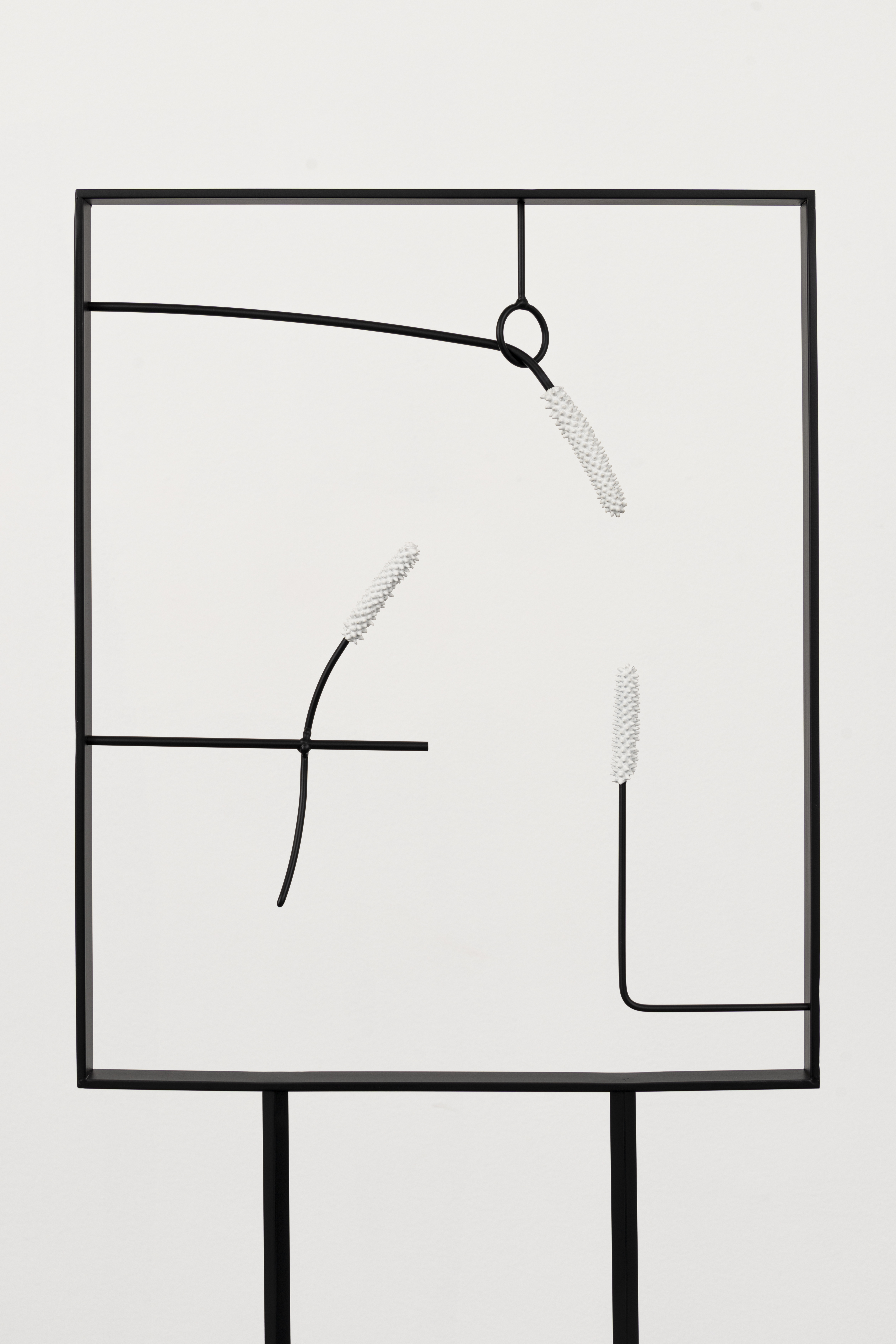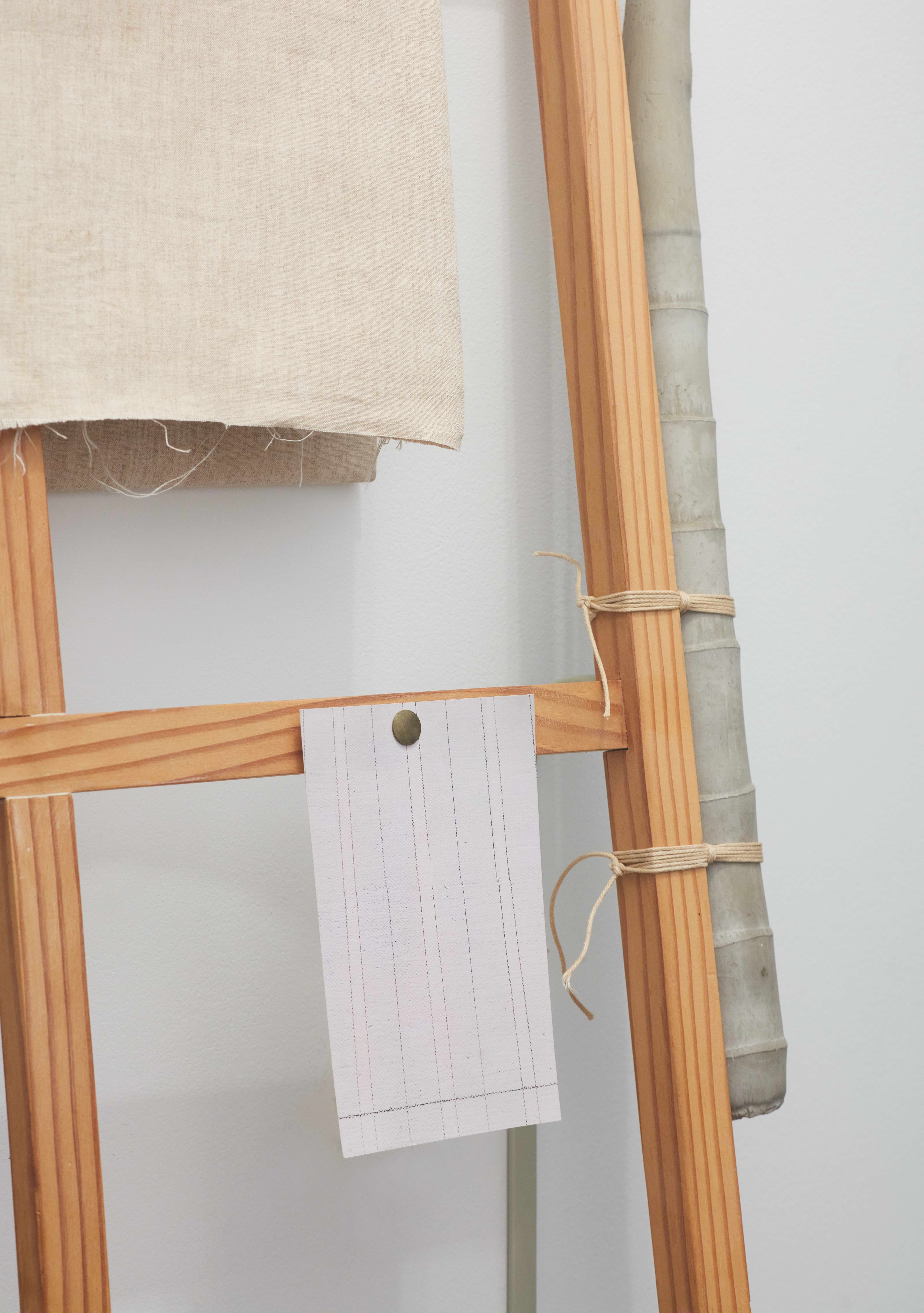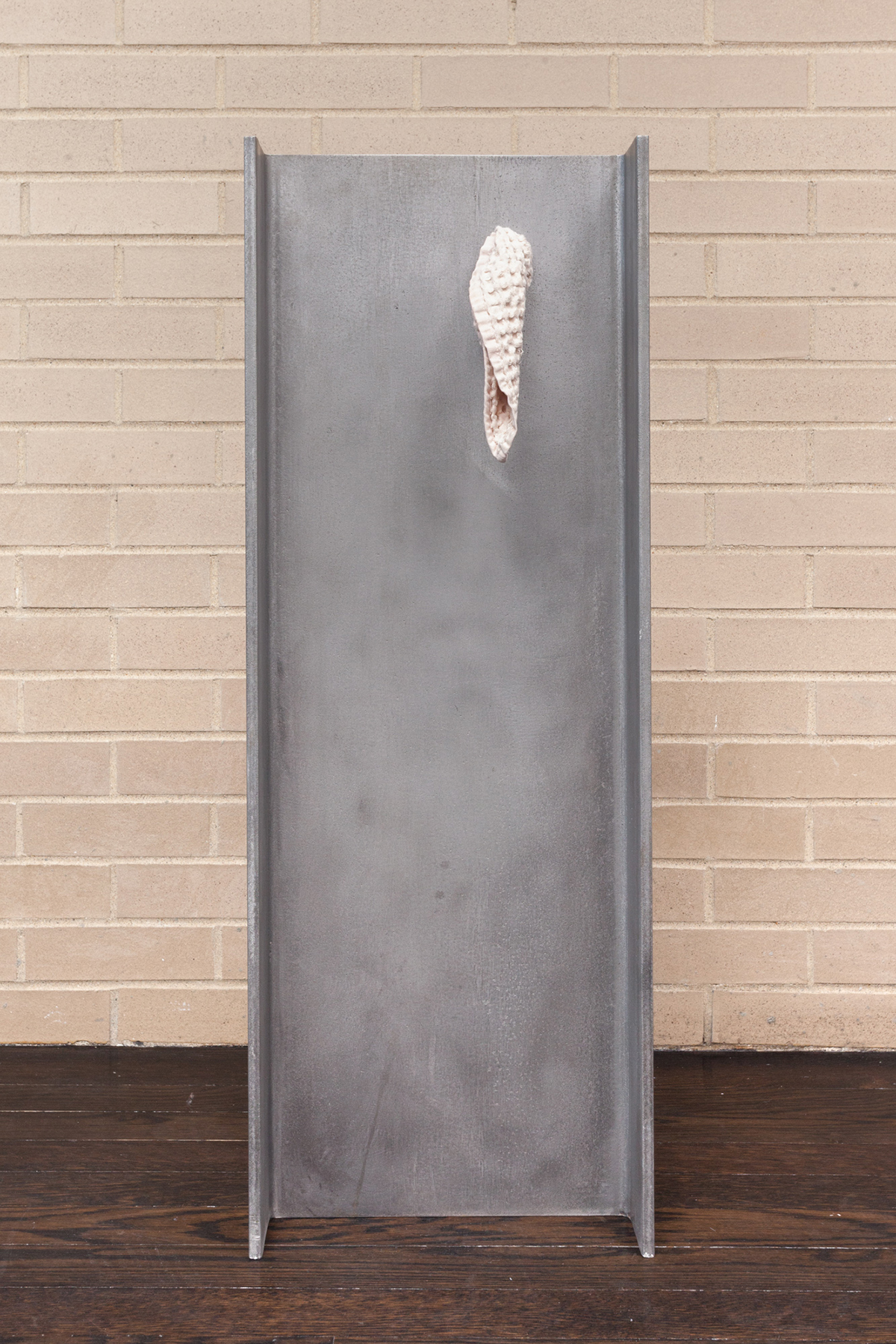 cotton hand towel, cast bronze lily bud, steel, and steel i-beam