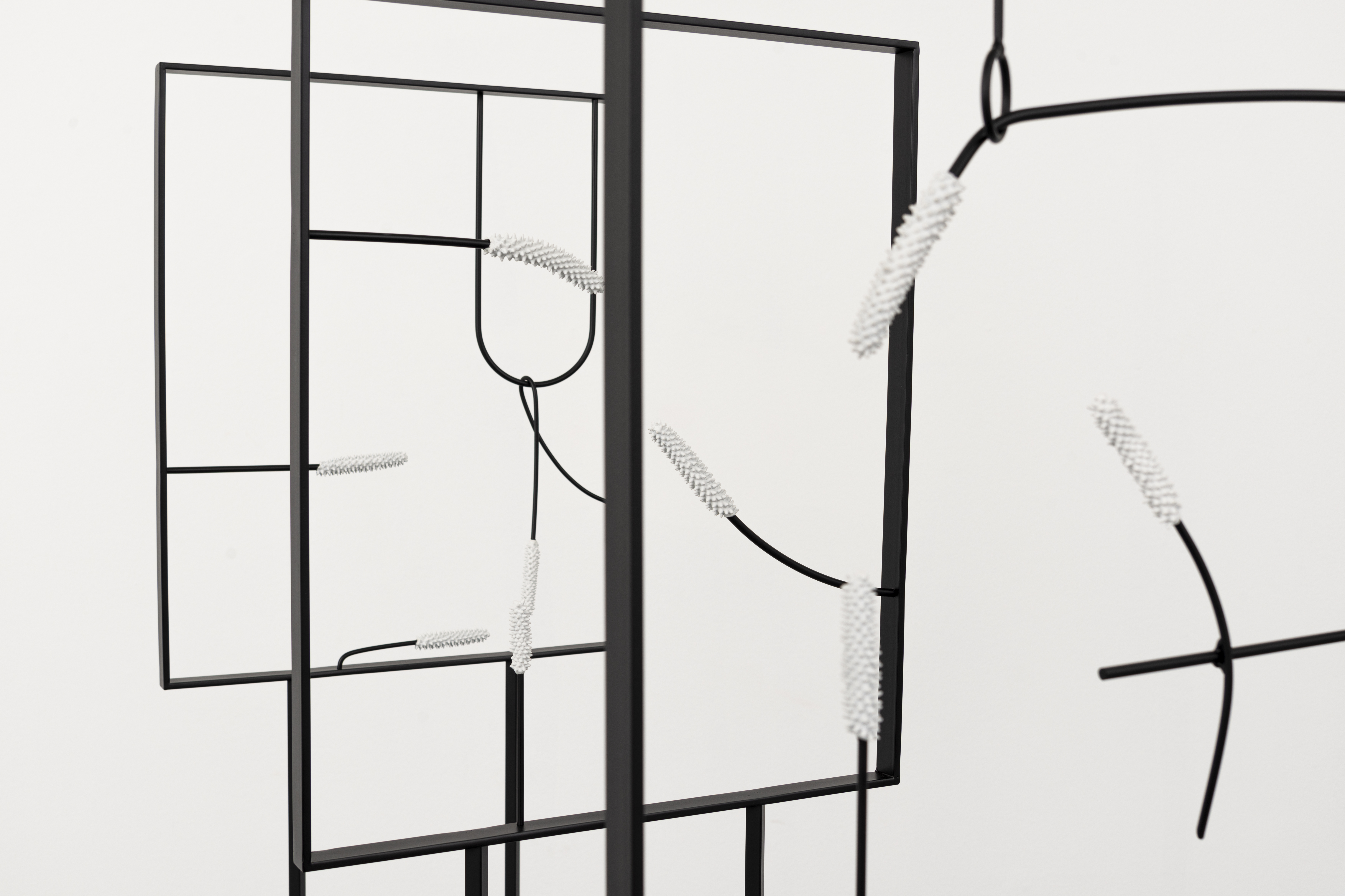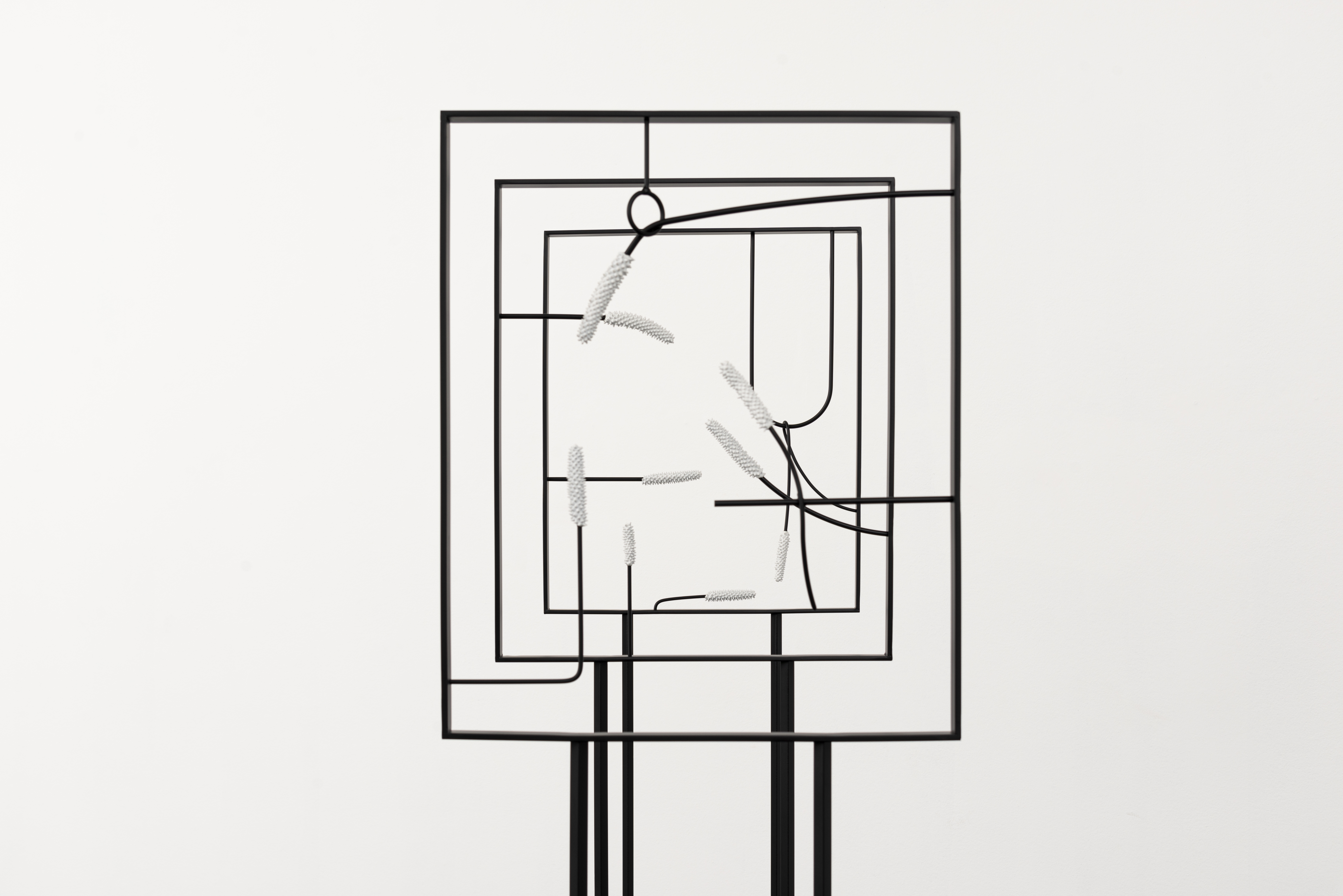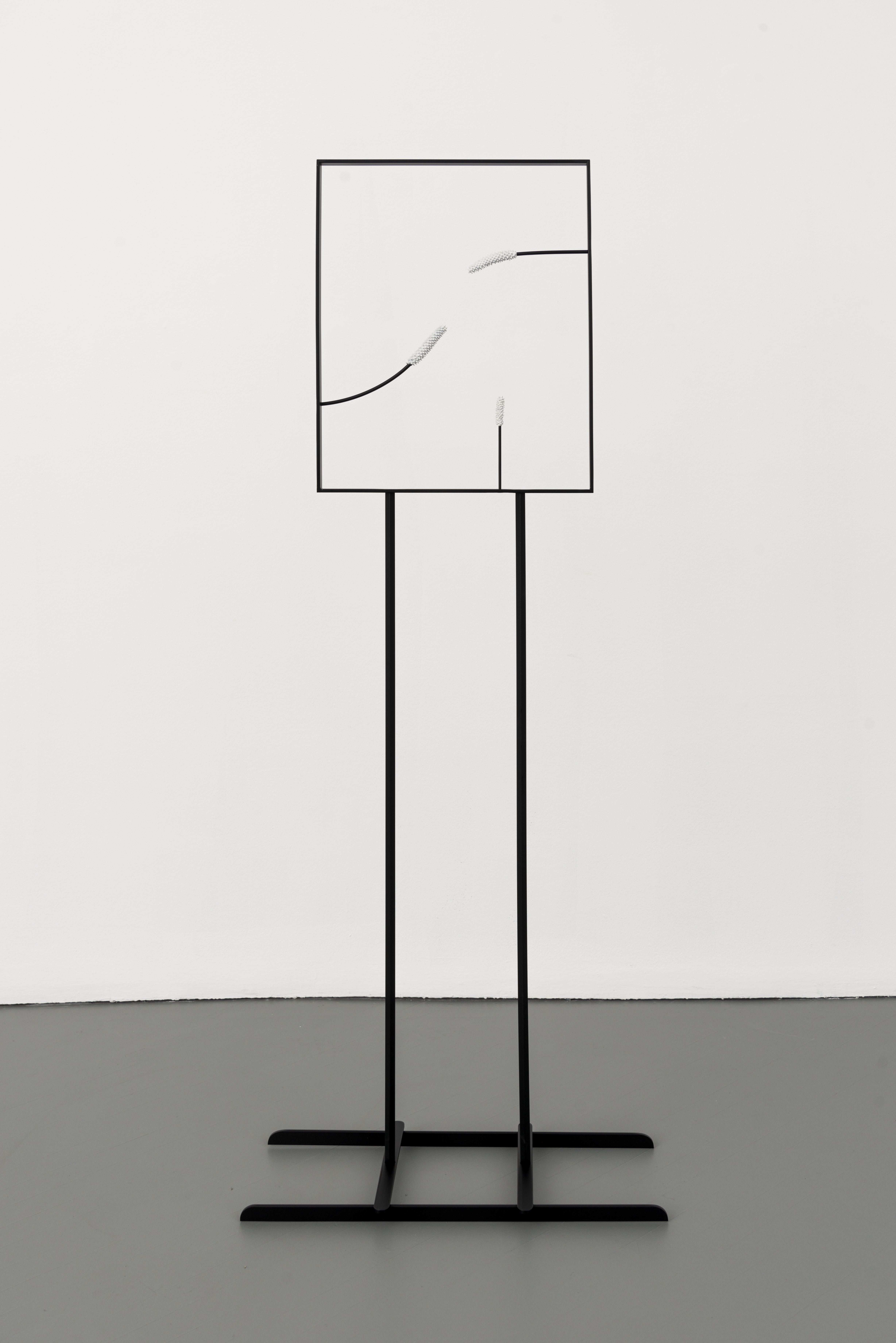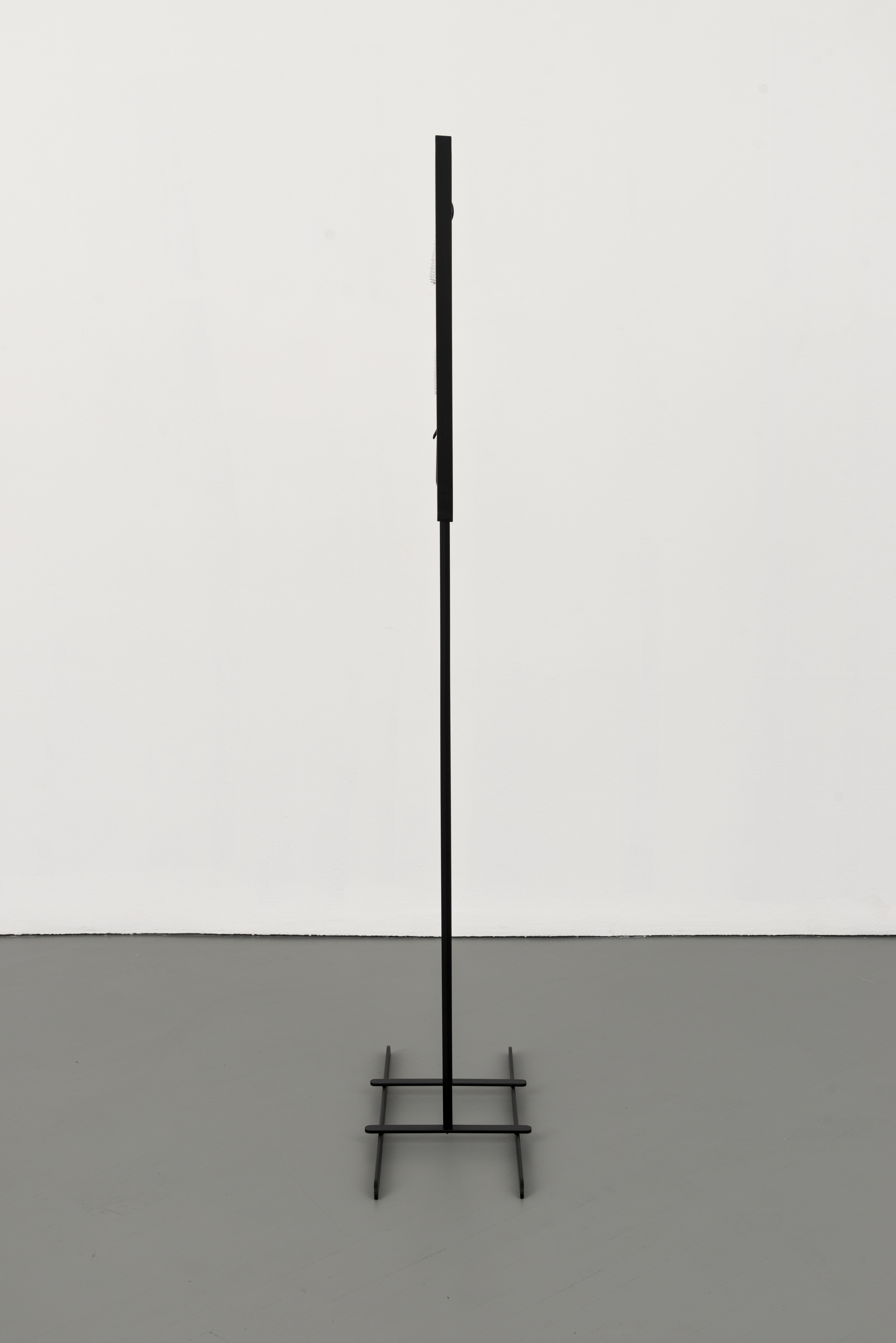 cotton hand towel, cast bronze lily bud, steel, and steel i-beam