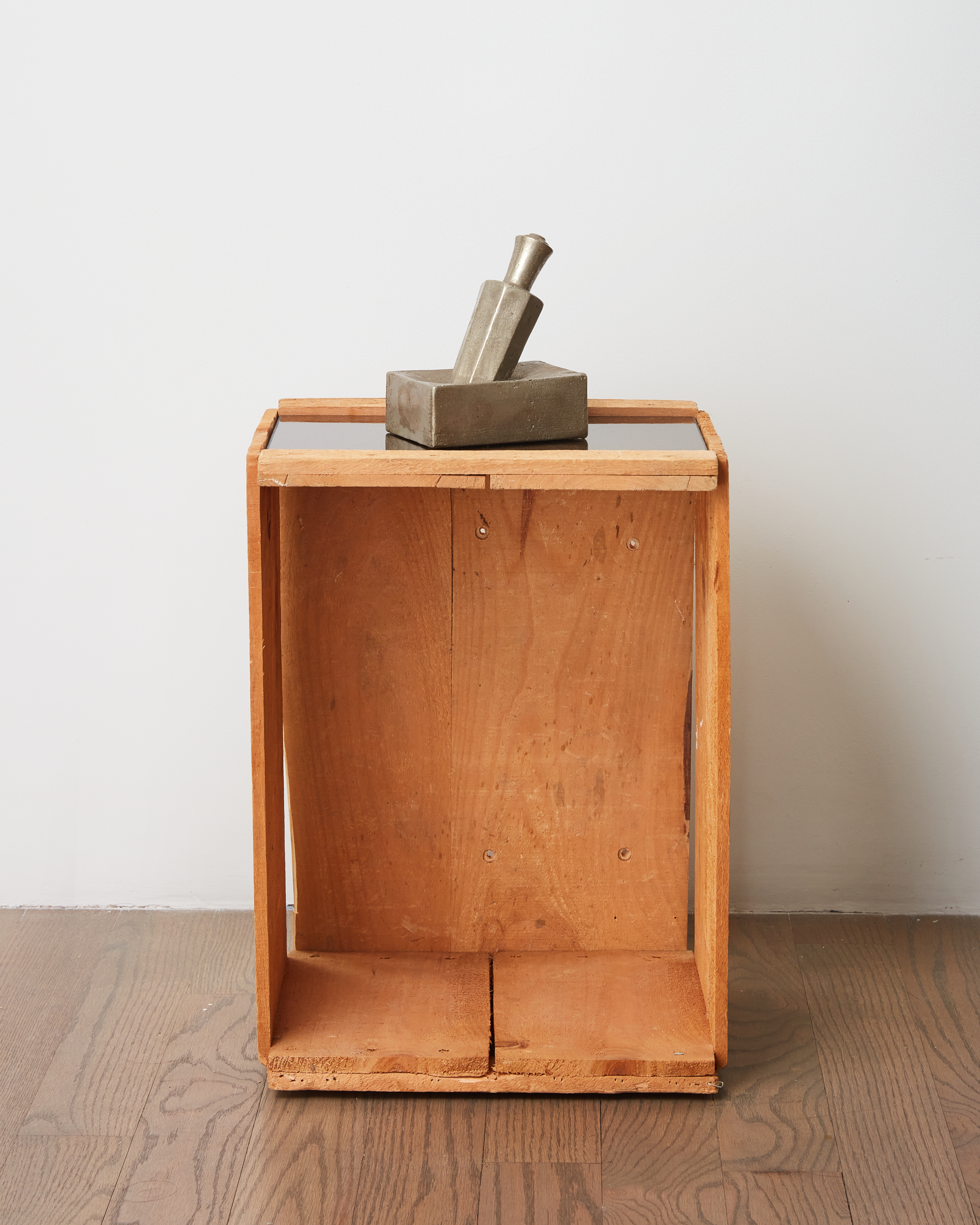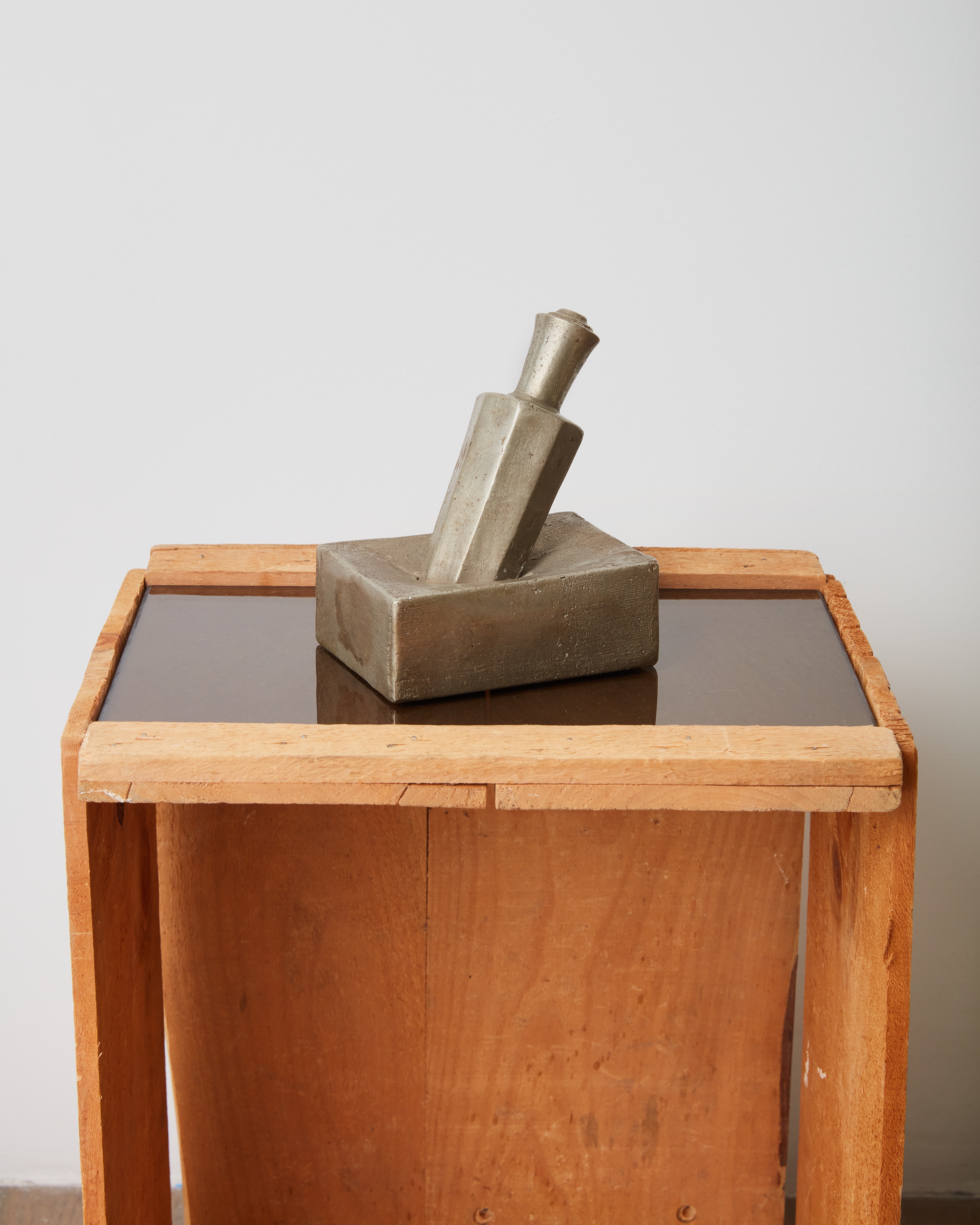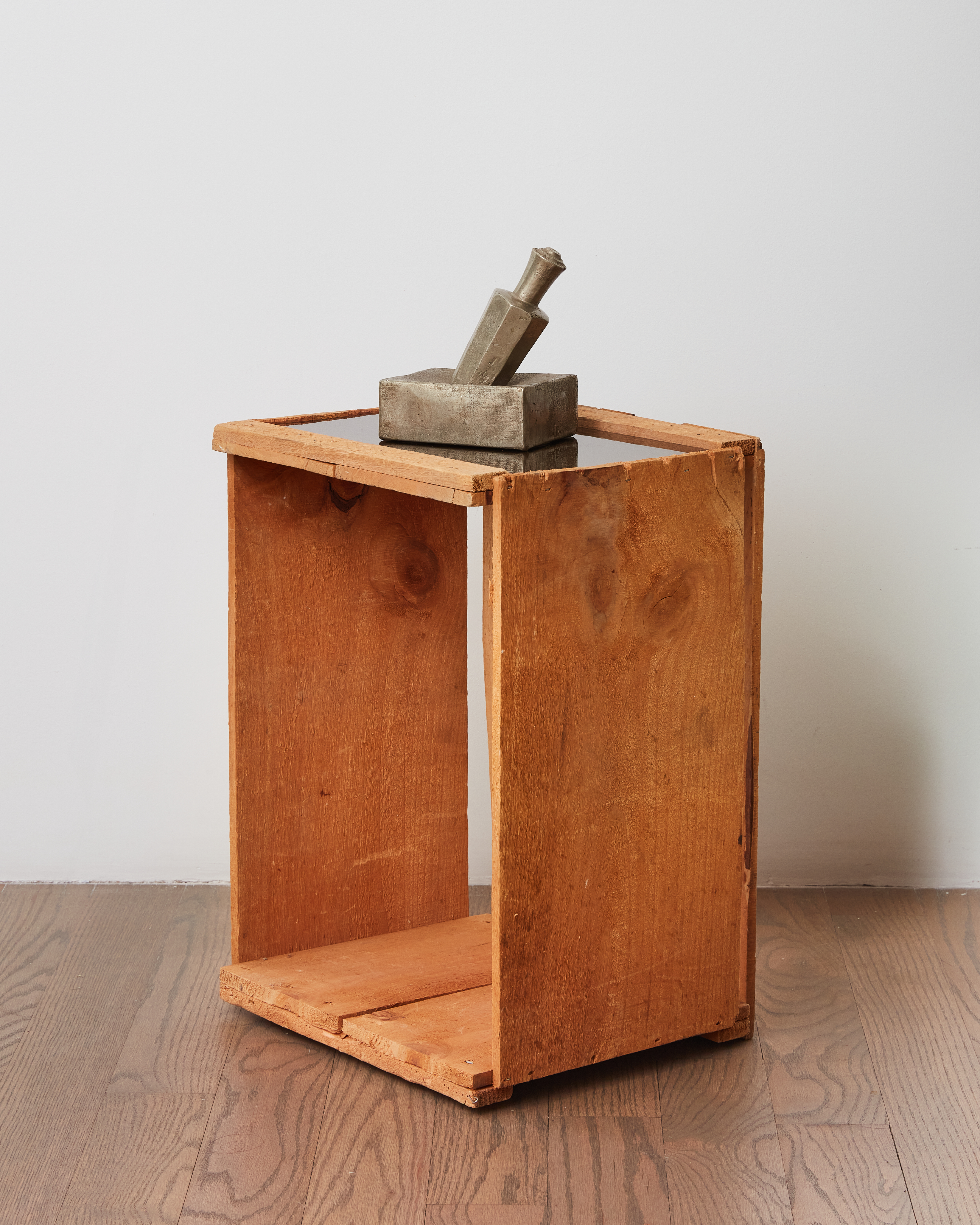 Cast perfume bottle (white bronze), grey glass and empty crate